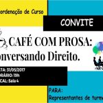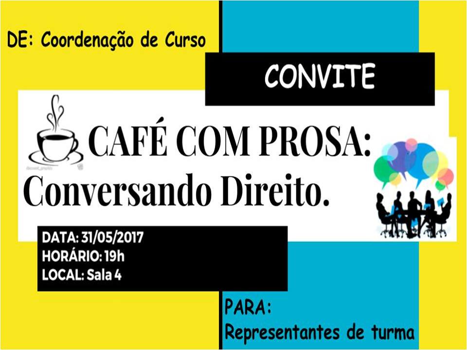 No dia 31 de maio de 2017, foi realizado o I “CAFÉ COM PROSA, CONVERSANDO DIREITO”, com participação de todos os representantes de turma da Fadivale. O objetivo desse encontro foi criar um espaço de escuta para que os representantes pudessem propor melhorias no ensino oferecido pela instituição.