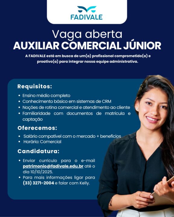 A Faculdade de Direito do Vale do Rio Doce (FADIVALE) anuncia a abertura de uma nova oportunidade de trabalho para o cargo de Auxiliar Comercial Júnior, reforçando seu compromisso em investir em profissionais dedicados e comprometidos com o crescimento da instituição.