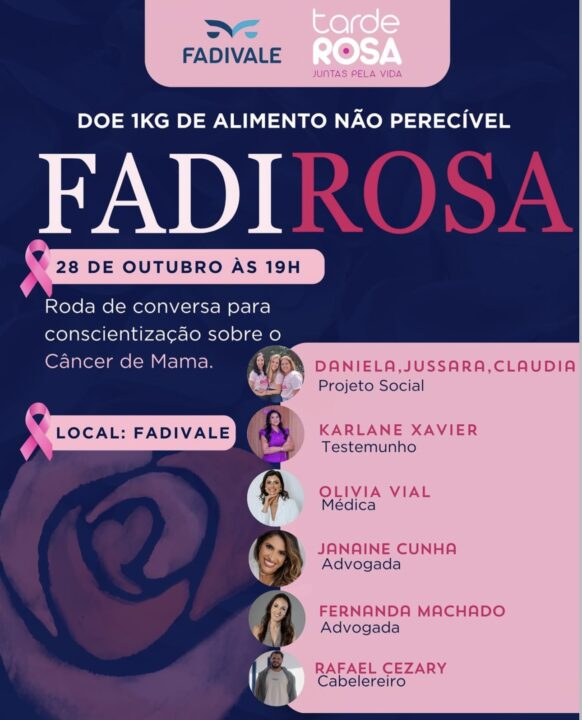 No dia 28 de outubro, às 19h, a FADIVALE abre suas portas para um evento especial em prol da vida, da solidariedade e da conscientização. O FADIROSA: Juntas pela Vida será uma roda de conversa voltada à prevenção e à conscientização sobre o câncer de mama, reunindo histórias inspiradoras, depoimentos emocionantes e profissionais que atuam com amor e propósito nessa causa.
